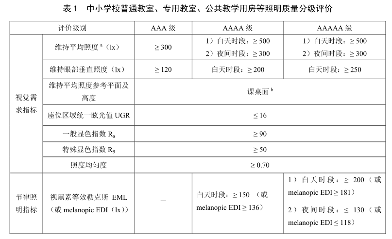 本標(biāo)準(zhǔn)在照明質(zhì)量分級(jí)評(píng)價(jià)中不僅規(guī)定了視覺需求指標(biāo),還規(guī)定了節(jié)律照明指標(biāo),還有照明系統(tǒng)要求與節(jié)能要求。